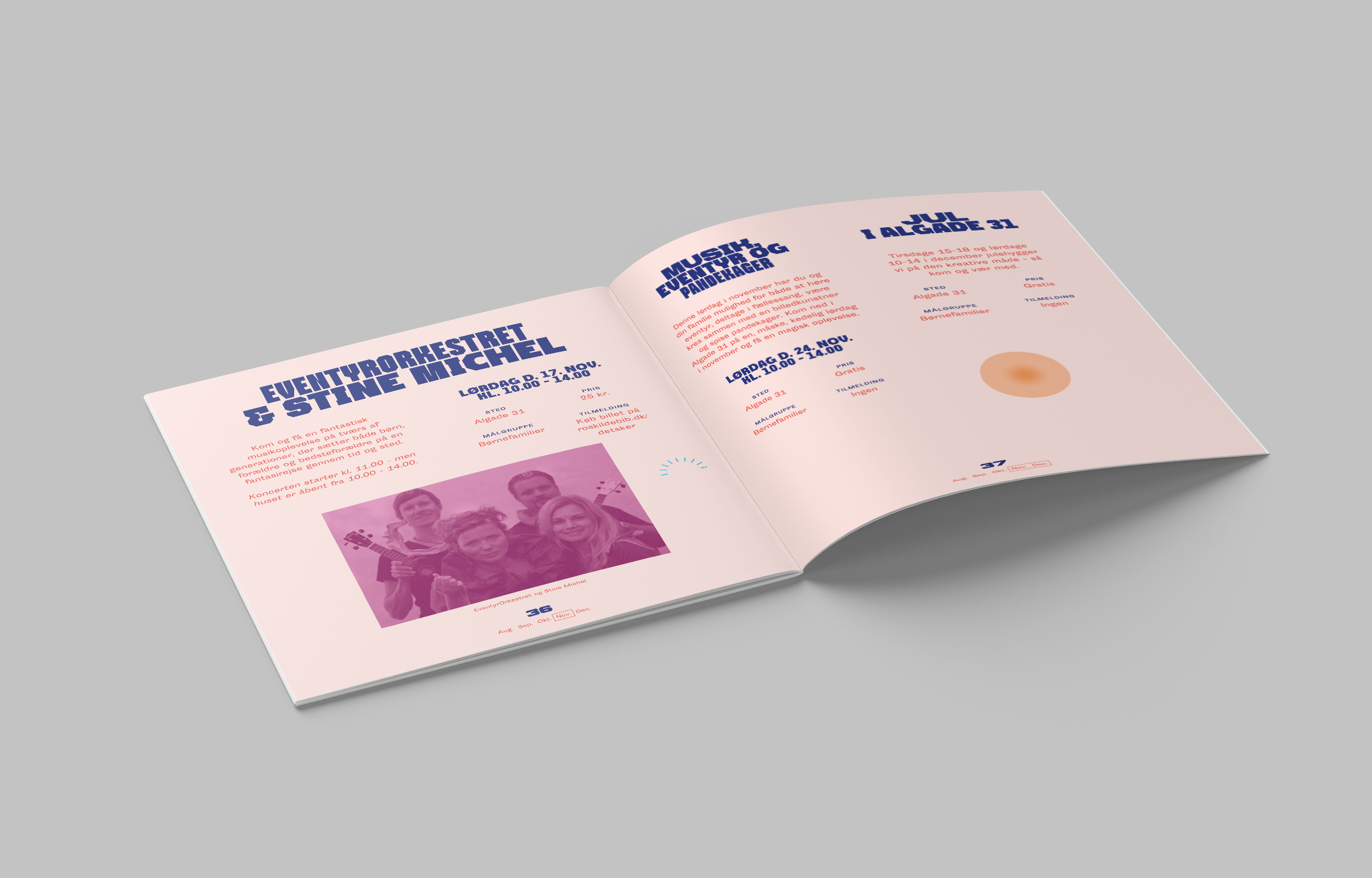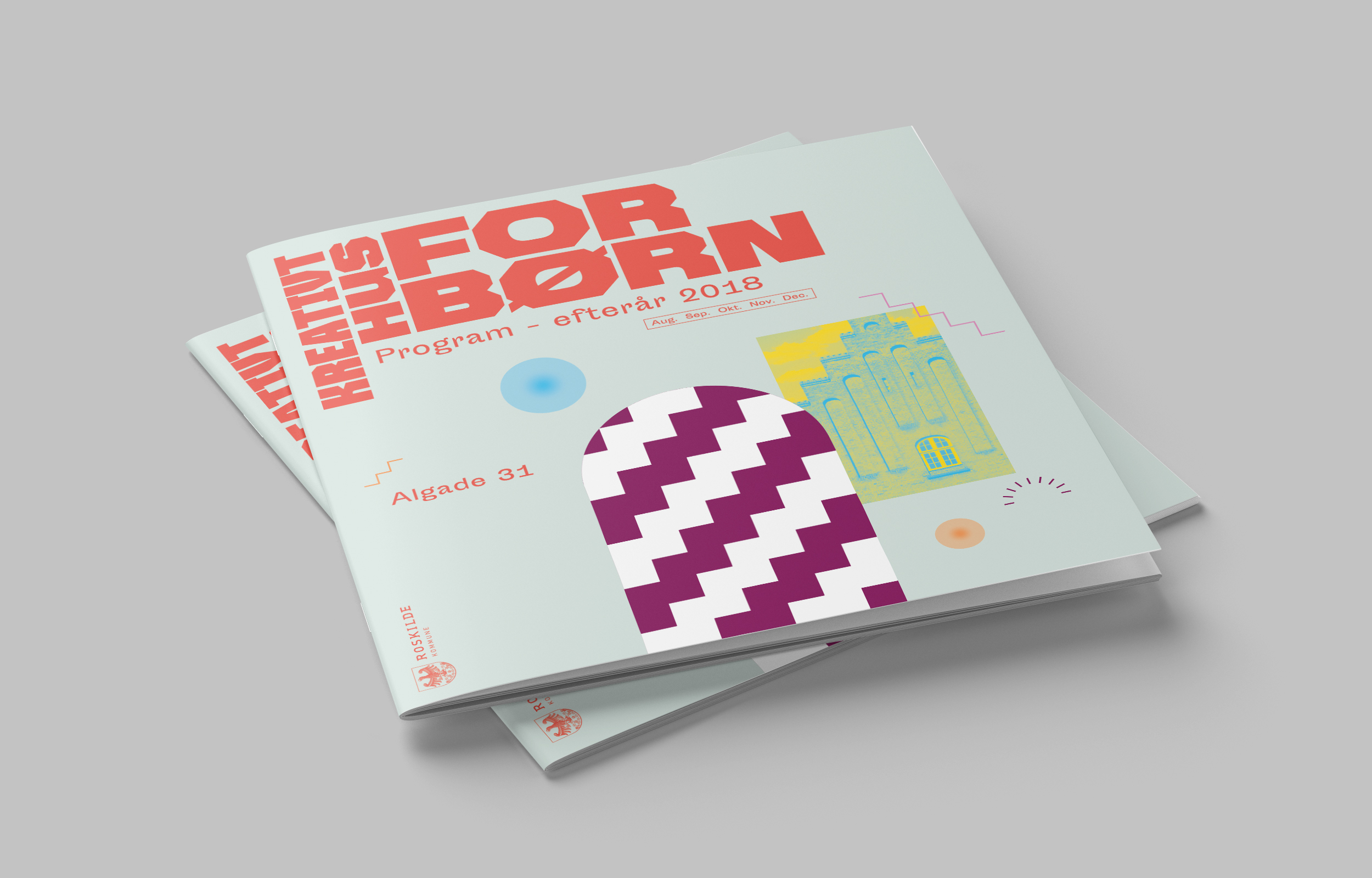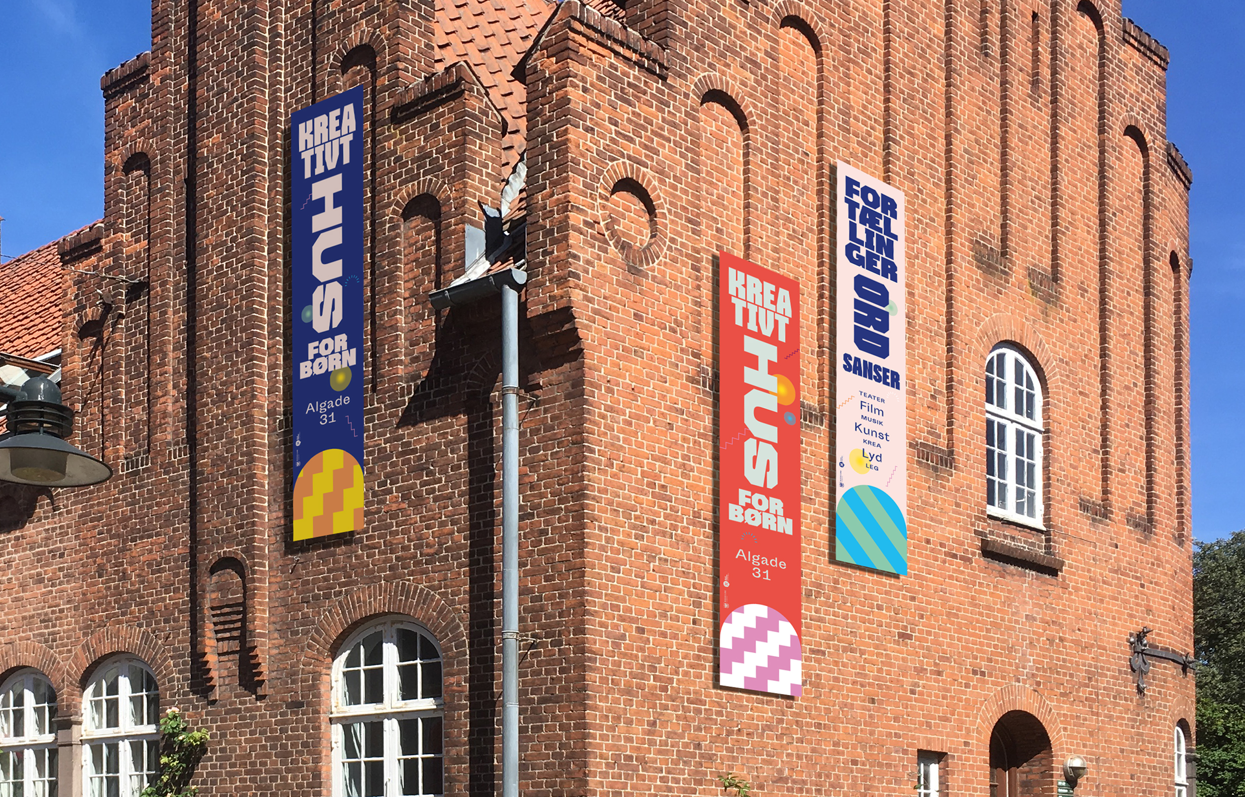 Visuel identitet til nyt børnekulturhus i Roskilde. Identiteten omfatter bl.a. design af program, skiltning, facadebannere og dekoration på vinduer.